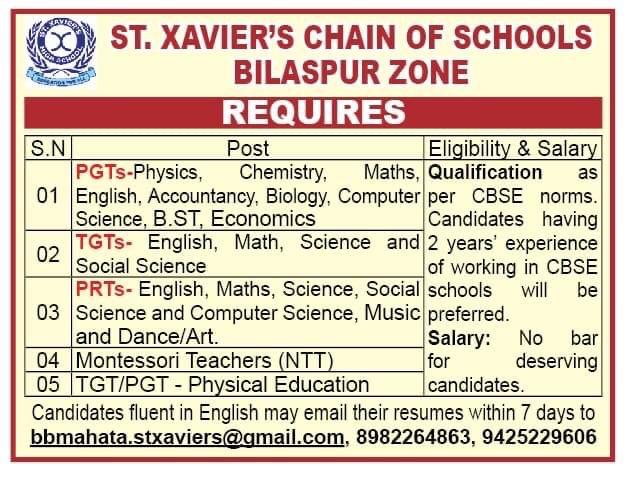 St. Xavier's chain of schools bilaspur zone, Chhattisgarh 5 posts